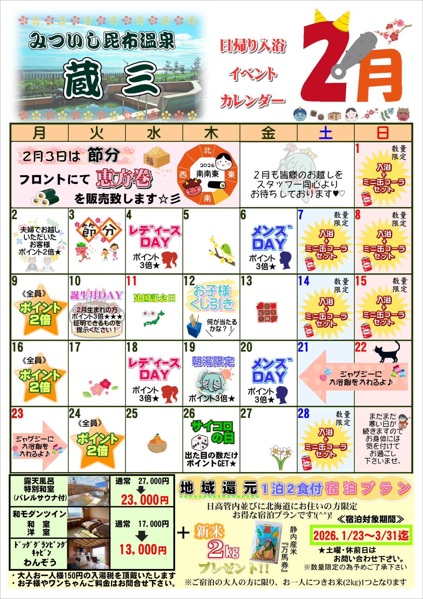 2月の日帰り入浴イベントカレンダーが完成いたしました👏
