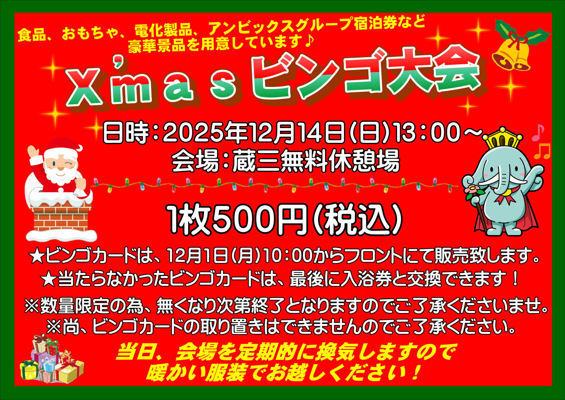 毎年ご好評をいただいております「クリスマスビンゴ大会」開催のお知らせです。